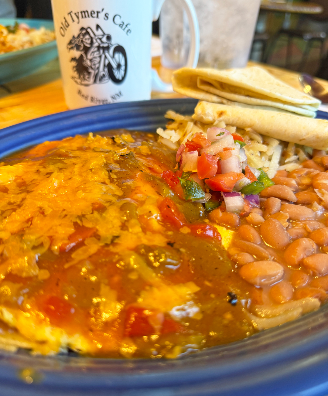 The next morning, needing coffee and a stout breakfast, we headed down Main Street to Old Tymers Cafe, a diner with a strong motorcycle theme. With hard rock blaring from the speakers and energetic, smiling staff, it felt like a party from the moment we stepped inside. Packed rooms full of satisfied, happy faces held the promise that we’d picked correctly. Both the giant pancakes and New Mexico–style eggs Benedict were calling me, but I decided to go with our server’s favorite, the breakfast enchiladas with green chile (cheese enchiladas with eggs, hash browns, and pinto beans with your choice of chile). My husband had a breakfast burrito with chorizo, Christmas. This order is the standard for him and how he assesses if the place passes; it did! My dish was smothered in a simple-looking green chile that was delightfully spicy and flavorful. A spoonful of pico de gallo on top of the pinto beans was the finishing touch.