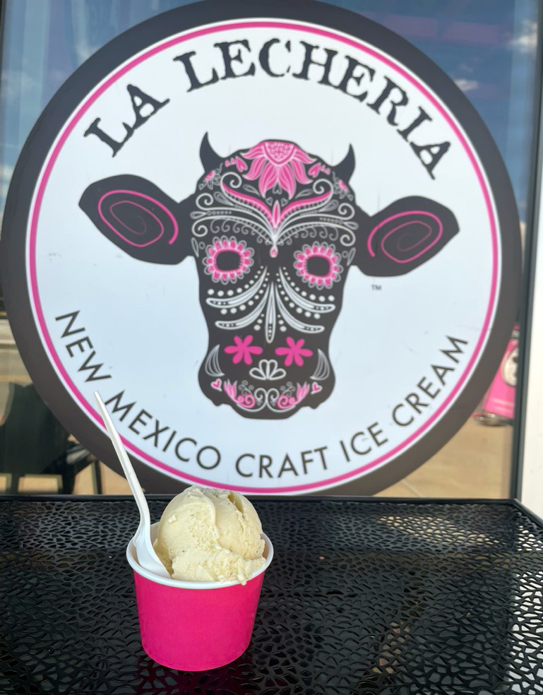 Taos Cow, a.k.a. The Cow, is one of New Mexico’s longest standing independent ice cream shops, and they’ve made their own mix with Rasband Dairy since they opened in 1993. “We go every week, sometimes twice a week,” says founder Jamie Leeson. “We make our mix in their mix tanks; they pasteurize and homogenize it for us, then they bottle it.” That base of milk, cream, egg yolks, and sugar becomes ice cream within a week—ten days, maximum, Leeson says—produced at Taos Cow’s factory in Santa Fe. From there it travels to their two locations, one with courtyard seating in Taos’s Cañon neighborhood and the other a food truck with a clutch of tables and chairs scattered along the verdant streamside. The pistachio white chocolate, made with Eagle Ranch pistachios from Alamogordo, is general manager Curly O’Connor’s favorite; Leeson likes vanilla because it highlights the quality of their mix. Should you require additional sustenance beyond what ice cream can provide, both spots also offer full menus.