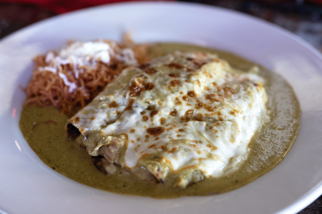 You can also find such traditional gems as the molcajete—both an appetizer or entrée and a serving dish—which Orozco said is the “star of the restaurant.” The entrée includes your choice of meat served in a large molcajete, or traditional Mexican mortar (the bowl used with a pestle to grind spices and salsa ingredients), filled with panela cheese, grilled chorizo, green onion, and nopal in a house sauce made with chipotle, green chile, and tomatoes. You can pick between chicken, shrimp, and sirloin, or go for a mix of all three—“cielo, mar y tierra.” All eyes follow the waiter delivering this extraordinary dish to a table.