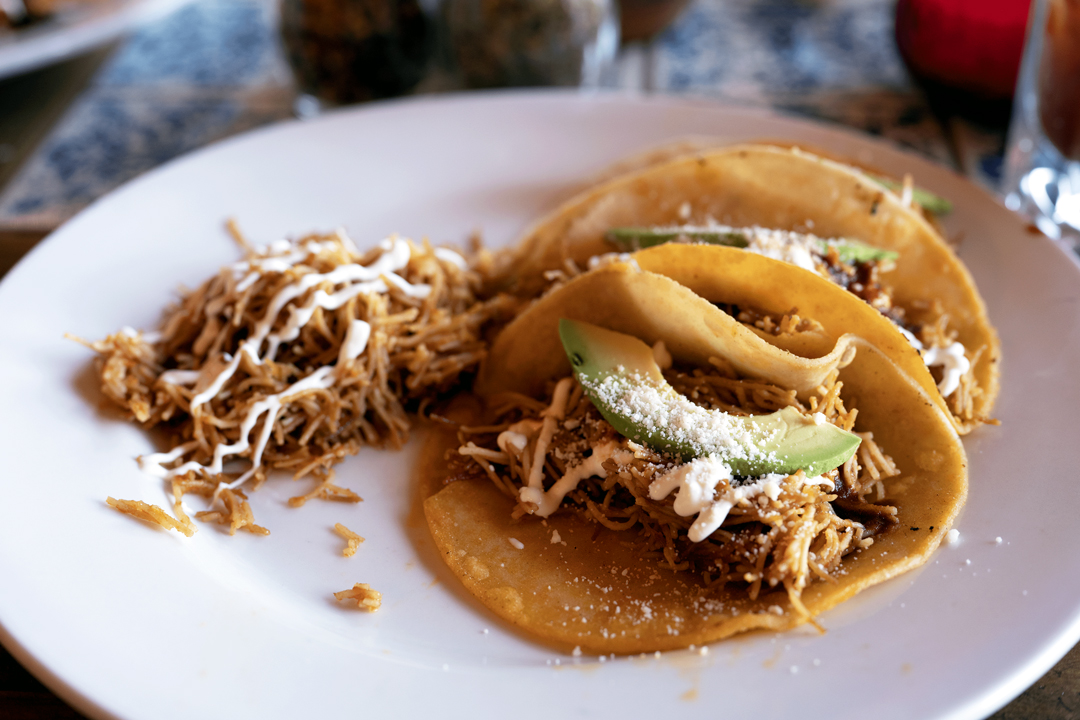 I tried the tacos de fideo seco on my latest visit because I love fideo, but I was most familiar with it served in a soup. The three toasted corn tortillas were filled with a generous helping of flavorful fideo cooked in a house blend of spices to a rice-like consistency. The small, dry noodles were topped with slices of fresh avocado, cotija, chipotle salsa, and sour cream. The dish is simple on its face, but the savory, spiced notes make it like eating a bowl of sopa de fideo wrapped up in a tortilla with a cool, creamy topping to finish. Casa El Camino’s fideo seco is also offered as a side dish, or just by itself.