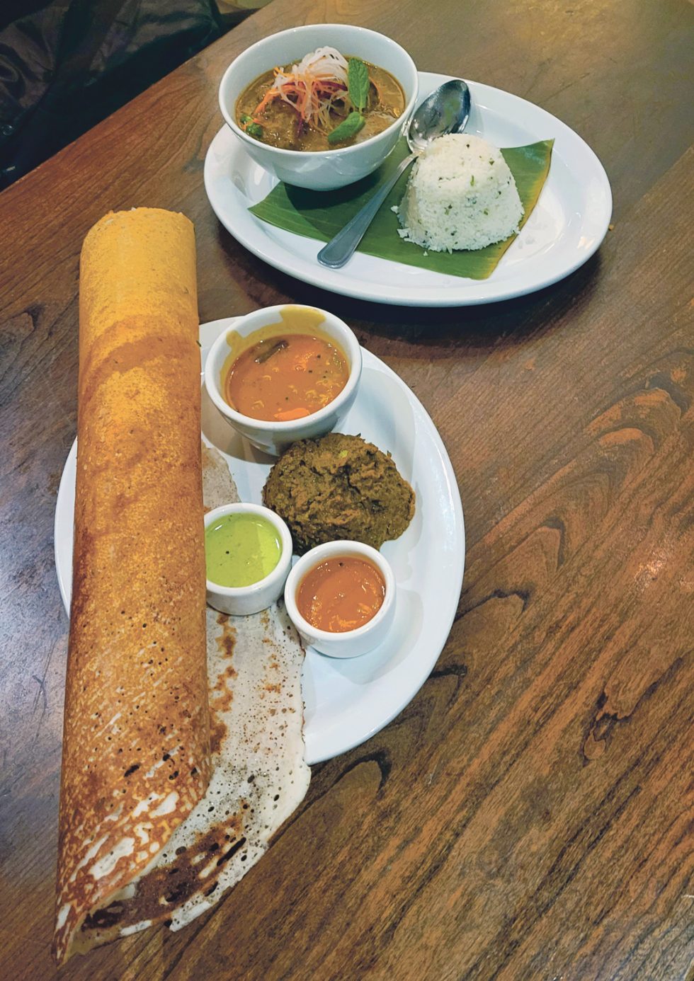 In her book Indian Cooking, Madhur Jaffrey explains the roles of Indian chutneys and yogurt raitas. “Their function,” she writes, “apart from teasing the palate with their sharp contrasts of sweet, sour, hot, and salty flavors, is to balance out the meal with added protein and vitamins.” I tried to convey this sentiment at Paper Dosa—a South Indian restaurant in Santa Fe specializing in dosas with curry masalas, lentil sambar, and various chutneys—when Ramona asked about the raita served with her Chennai chicken. I told her it would cool the chicken’s spice. “Like milk,” she said, but even after experiencing its cooling effect off a fork tine, she still used the raita sparingly.