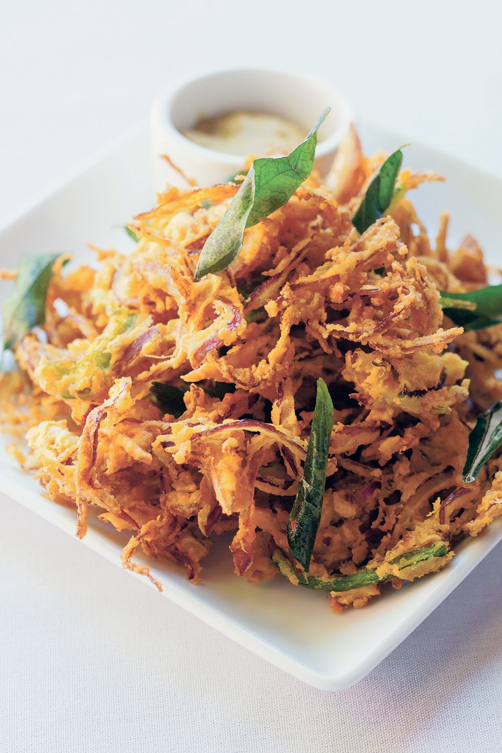 Above: Kale and onion pakora with eggplant chutney; Chennai chicken with raita; Chettinad lamb curry and lamb keema dosa served with sambar and chutneys. All dishes from Paper Dosa.